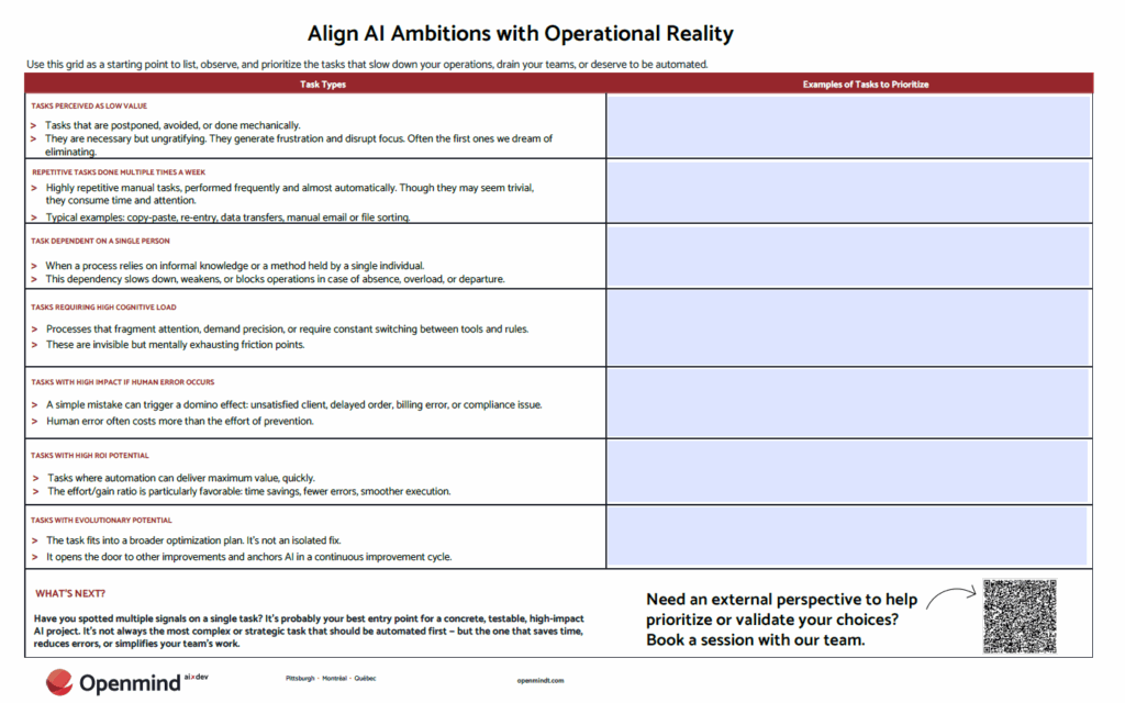 Join a collaborative AI initiative. Identify partners, propose a workshop (like Openmind’s roundtables 😉), or join a sectoral group. The more you open up, the faster your organization accelerates toward digital automation and positions itself as an essential ecosystem player.